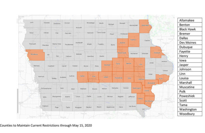 For the other 22 counties (Allamakee, Benton, Black Hawk, Bremer, Dallas, Des Moines, Dubuque, Fayette, Henry, Iowa, Jasper, Johnson, Linn, Louisa, Marshall, Muscatine, Polk, Poweshiek, Scott, Tama, Washington, and Woodbury) all previous restrictions and closures remain in place until 11:59 p.m. on Friday, May 15, unless sooner terminated or extended by the Governor. NOTE: The Governor’s Proclamation leaves certain restrictions and closures in effect for the entire state until Friday, May 15, those are noted in Part 1, Section 3.