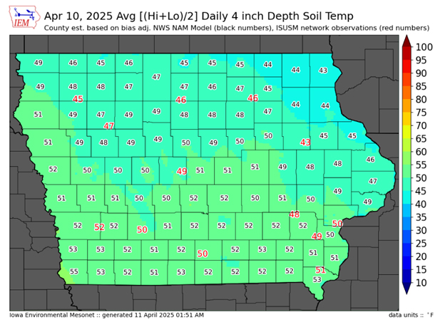 According to Iowa State University Soil Monitoring, the current soil temperatures around the state are solidly in the 40s and low 50s across the state, with temperatures rising about 2-5 degrees in most counties from last week. Corn and soybean planting can generally begin once the temperature reaches the low- to mid-50s.