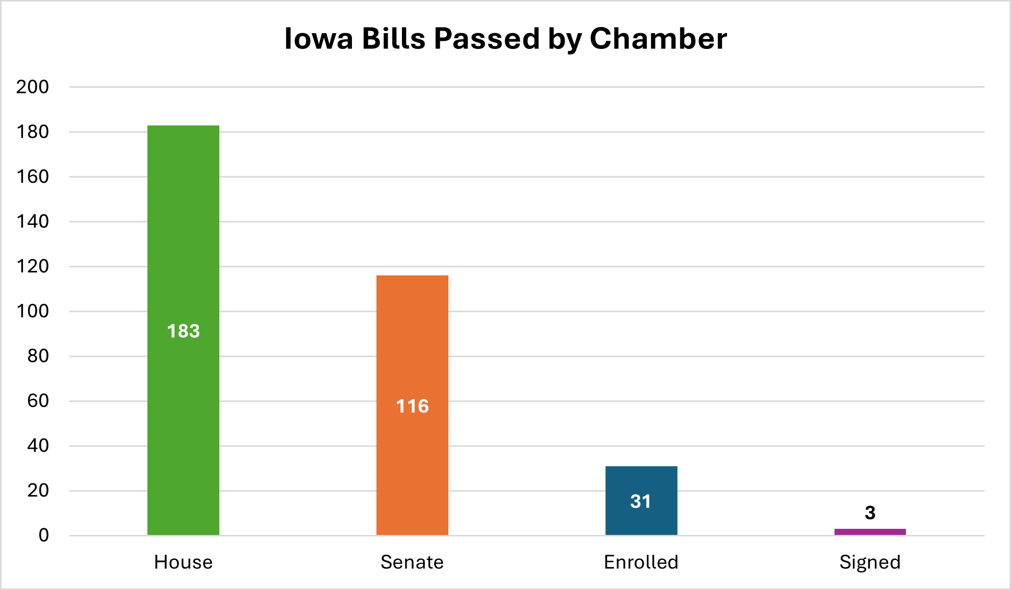 Week 11 of the 2026 Iowa Legislative Session was the first week after the second funnel deadline, which substantially narrowed the bills eligible for consideration. Last week, the Senate could only consider House bills, House joint resolutions, and bills placed on the unfinished business calendar; likewise, the House took up only Senate bills, Senate joint resolutions, and bills placed on the House unfinished business calendar.