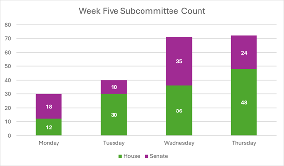 In week five, the chambers hosted over 200 subcommittees to get bills on the agenda and voted out of committee ahead of the first funnel. This week marks the first funnel deadline, so most bills must pass out of committee in their originating chamber to remain eligible for passage in 2026.