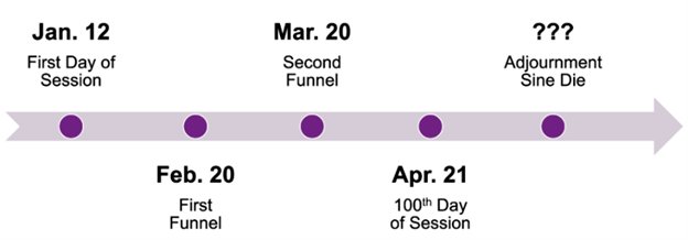 This week, the chambers are expected to engage in minimal floor debate, if any at all. Attention will instead be on passing bills through subcommittee and committee to push them through the second funnel on March 20.
