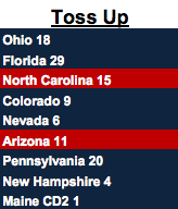 According to the most recent data, eight states (and Maine’s second congressional district) are toeing the line in the toss-up column. Six of the them went Democratic in the last presidential contest. Together they represent another 113 electoral votes. The math means that Trump, if the election were held today, could afford to lose only Florida (with 29 votes) or a combination of two other states (e.g., Pennsylvania and Colorado, Ohio and Nevada, or North Carolina and Arizona).