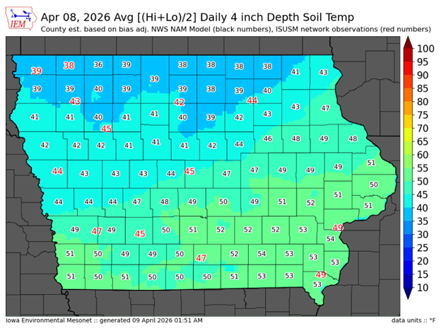 According to Iowa State University Soil Monitoring, current soil temperatures around the state are slightly below 40 degrees in the northwest, solidly in the 40s in the central portion of the state, and near or above 50 degrees in the southern half of the state.