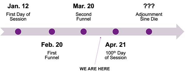 With less than two weeks until the scheduled 100th day of session, legislators appear eager to reach deals on outstanding issues and budgets. However, the House has yet to take floor action on property taxes and to introduce several budget bills. Legislative leaders will focus on resolving these remaining issues and an agreement on a final budget for the Governor to sign within 30 days of sine die.