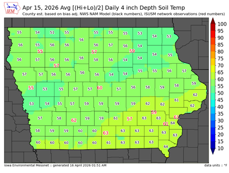 Historically, Iowa’s legislative calendar is based around the planting and growing season, and the legislature typically adjourns around the time when the soil temperature is high enough to begin fieldwork for the new growing season. According to Iowa State University Soil Monitoring, current soil temperatures are solidly in the 50s and 60s across the state.